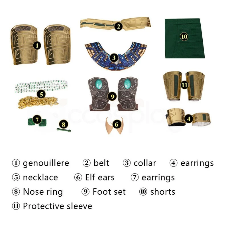 | Full Set Including | Genouillere, Belt, Collar, Earrings, Necklace, Elf Ears, Earrings, Nose Ring, Foot Set, Shorts, Protective Sleeve |